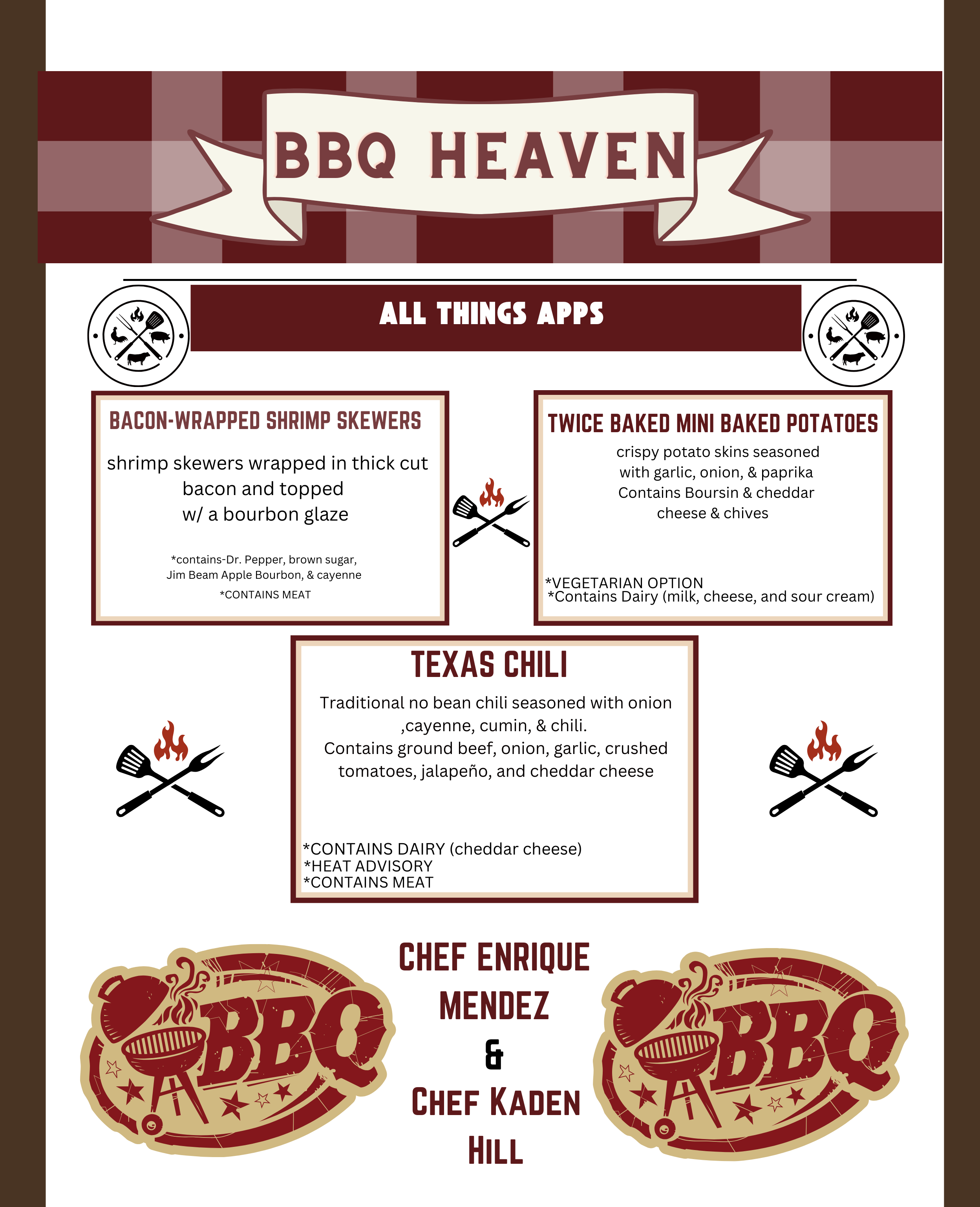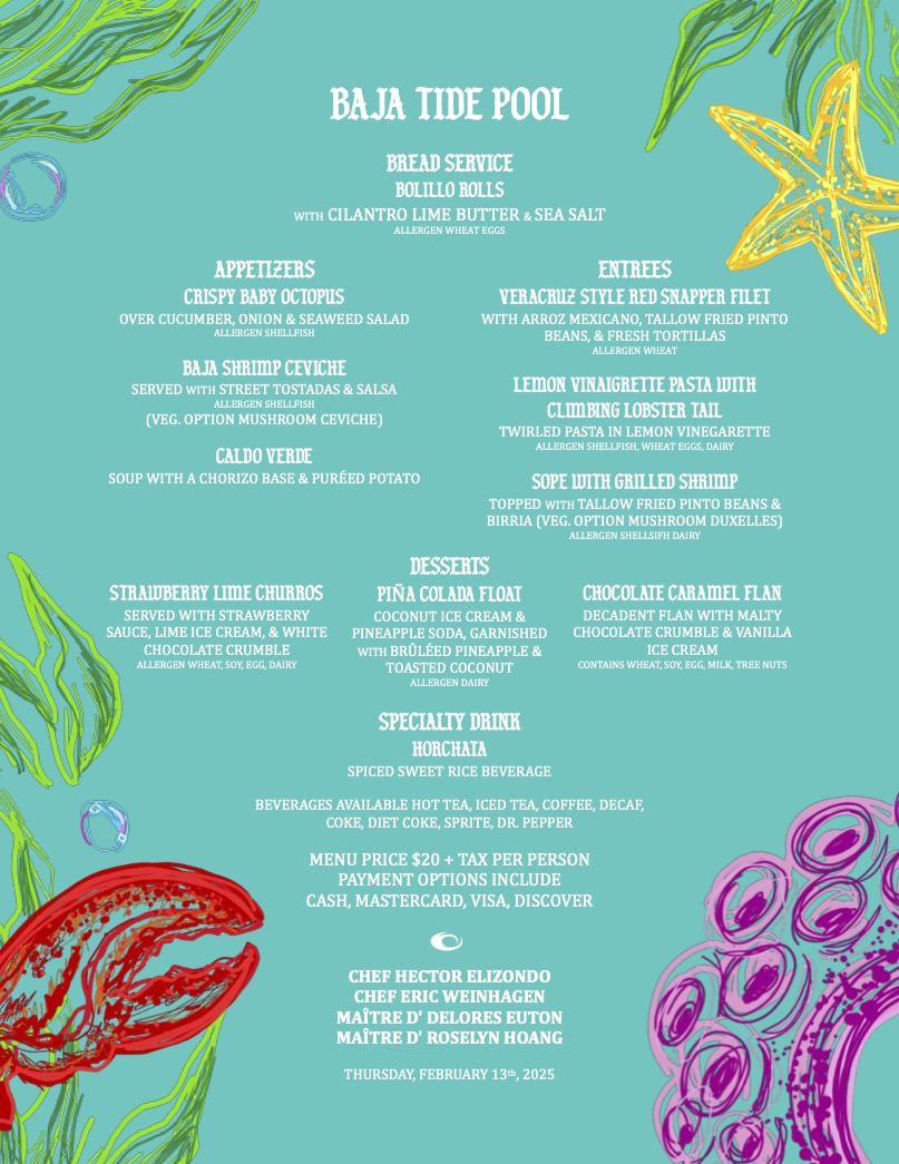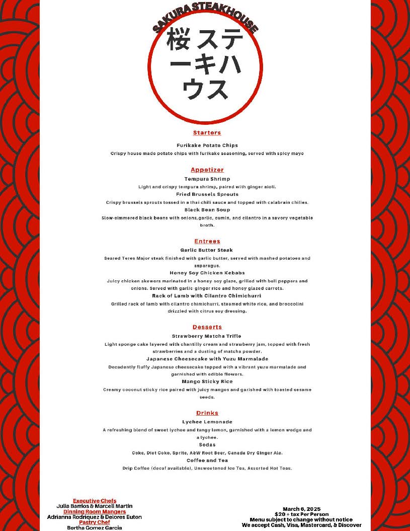 Each week features a menu created and implemented by a student executive chef and a maître d'. This combination allows students in the Dining Room Service class to support the front-of-the-house restaurant management experience while the A La Carte Cooking students prepare, cook, and expedite food in the back-of-house.
