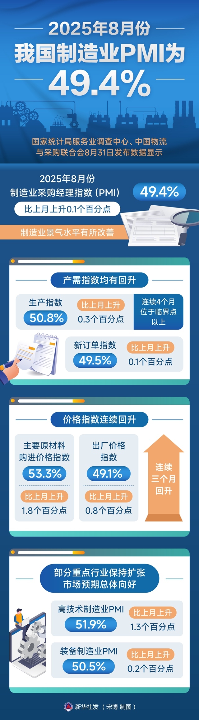 国家统计局服务业调查中心、中国物流与采购联合会8月31日发布数据显示,2025年8月份制造业采购经理指数(PMI)为49.4%,比上月上升0.1个百分点,制造业景气水平有所改善。