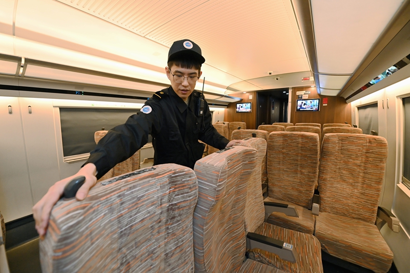 1月15日,动车机械师对动车车厢内座位进行检查。
