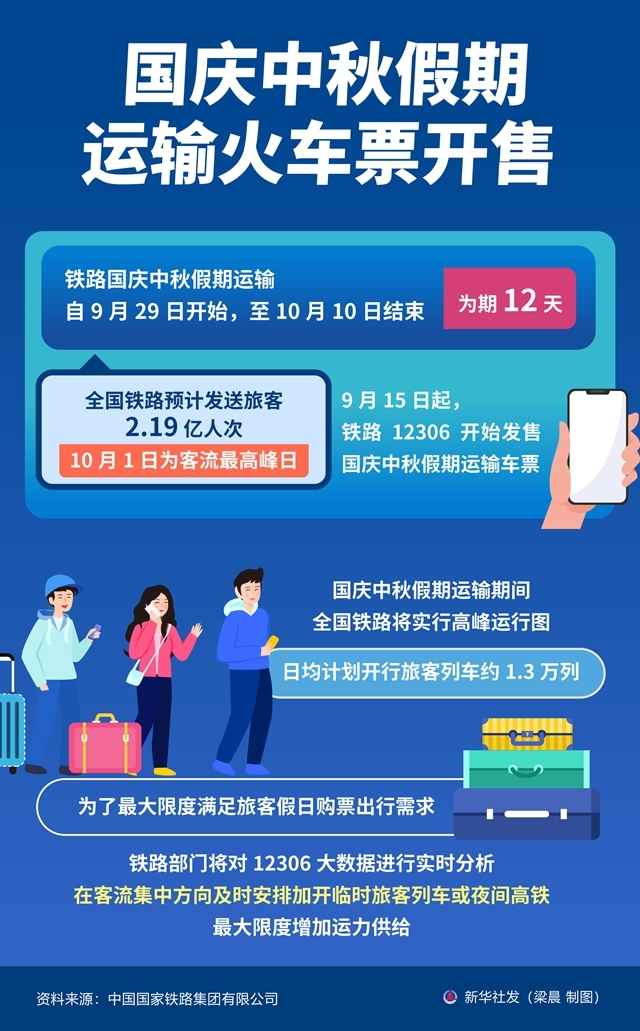 记者从中国国家铁路集团有限公司获悉,铁路国庆中秋假期运输自9月29日开始,至10月10日结束,为期12天,全国铁路预计发送旅客2.19亿人次,10月1日为客流最高峰日。15日起,铁路12306开始发售国庆中秋假期运输车票。