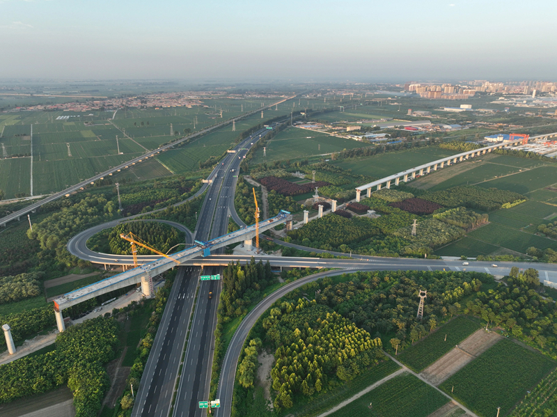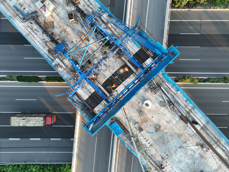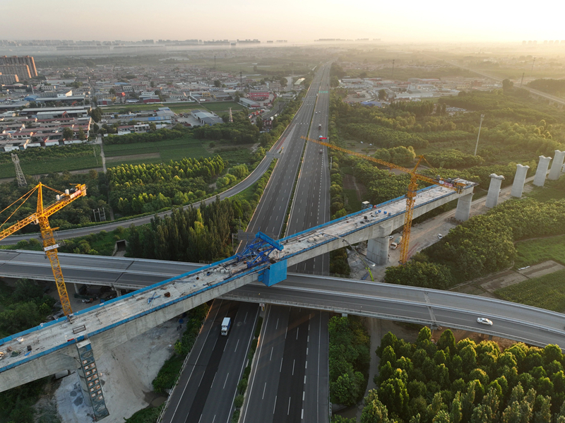 7月18日拍摄的雄忻高铁保定东特大桥跨京港澳高速连续梁中跨施工现场(无人机照片)。