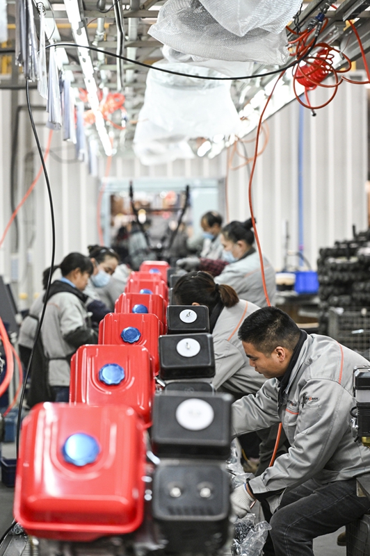 2月22日,工人在重庆华世丹机械制造有限公司微耕机生产线上作业。