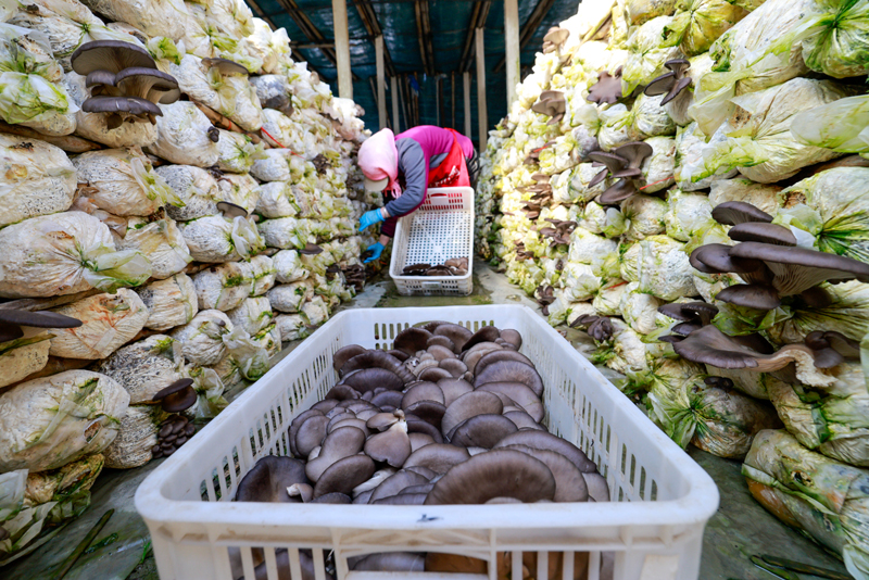 2月24日,河北省唐山市丰南区东田庄镇大吴庄村农民在大棚内采摘平菇。