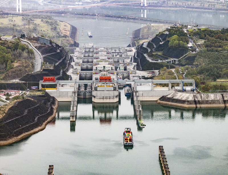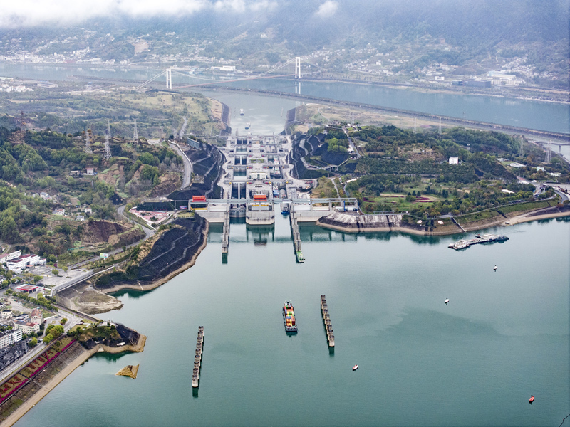 3月29日,在湖北宜昌,船舶有序通过三峡双线五级船闸(无人机照片)。