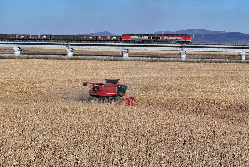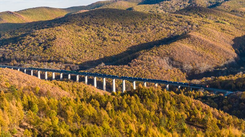 10月18日,一列满载进口物资的货物列车驶向中国铁路哈尔滨局集团有限公司绥芬河站(无人机照片)。