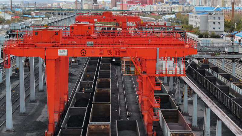 10月18日,在中国铁路哈尔滨局集团有限公司绥芬河站,机械化换装场在对入境货物进行换装作业(无人机照片)。