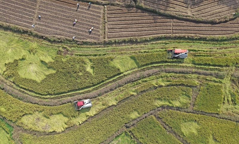 10月17日,在浙江省台州市仙居县双庙乡,农机手驾驶农机收割晚稻(无人机照片)。