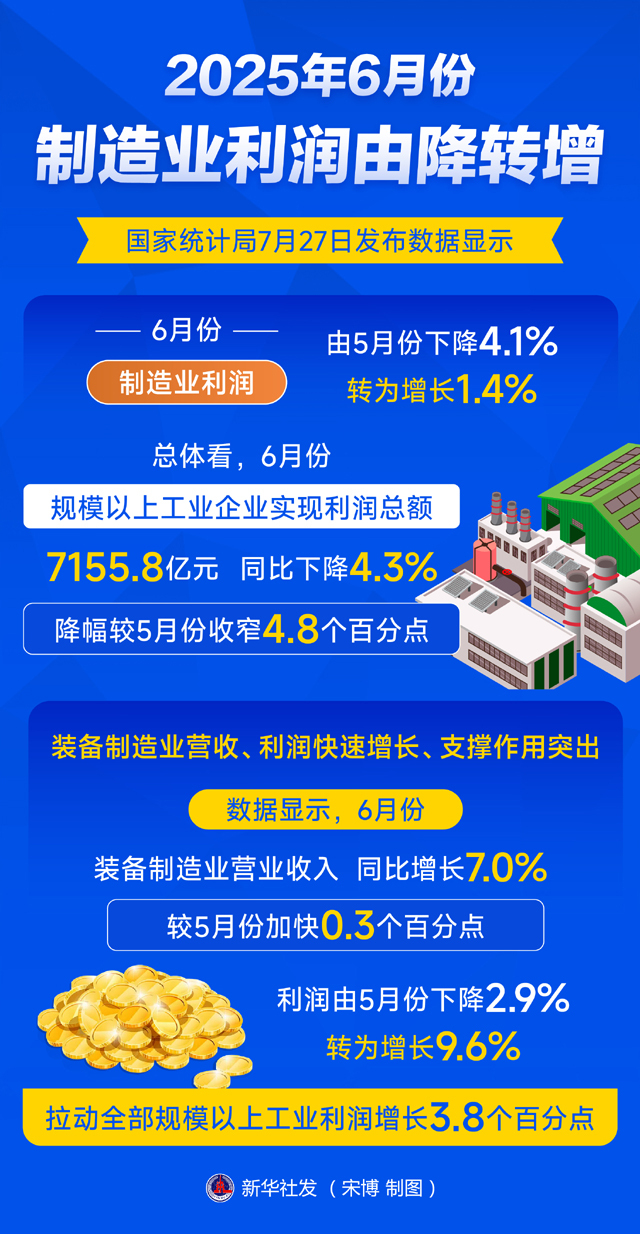 国家统计局7月27日发布数据显示,6月份,制造业利润由5月份下降4.1%转为增长1.4%。总体看,6月份,规模以上工业企业实现利润总额7155.8亿元,同比下降4.3%,降幅较5月份收窄4.8个百分点。
