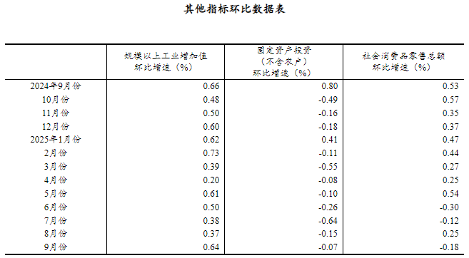 (2)根据季节调整模型自动修正结果,对近一年来各期国内生产总值、规模以上工业增加值、固定资产投资(不含农户)、社会消费品零售总额环比增速进行修订。修订结果及2025年三季度GDP环比数据、2025年9月份其他指标环比数据如下: