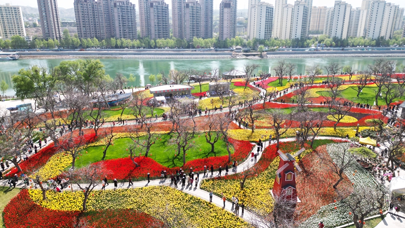 4月30日,游客在甘肃省永靖县黄河花堤赏花游玩(无人机照片)。
