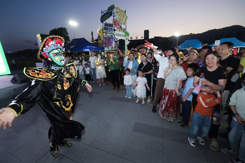 5月1日,在浙江省建德市更楼街道的城南城市田园,游人在夜市上观看演出。