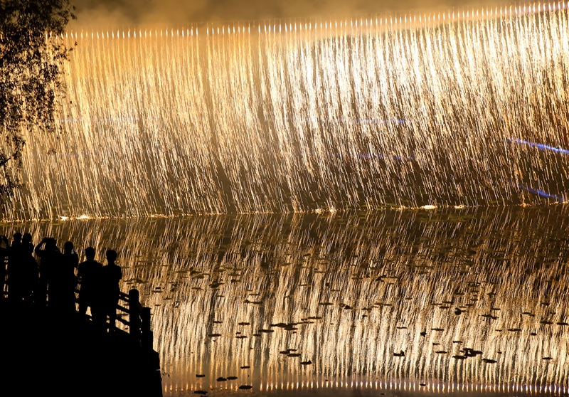 5月1日,游人在江苏省句容市宝华山国家森林公园观看“烟花瀑布”。