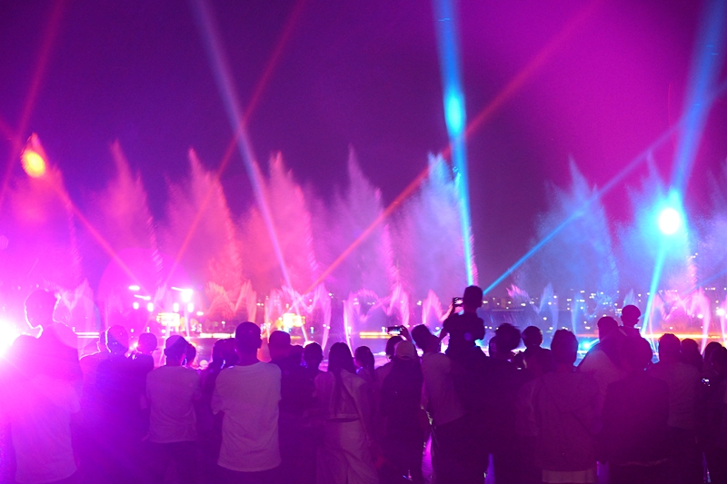 5月1日,人们在河南省商丘市日月湖景区观赏音乐喷泉。