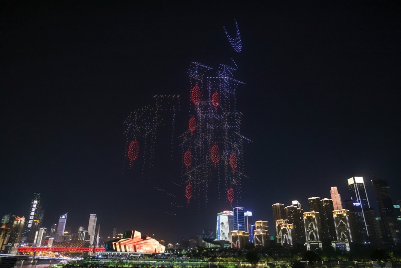 5月1日晚,在重庆市南岸区,“魅力重庆”常态化无人机灯光秀进行五一展演。