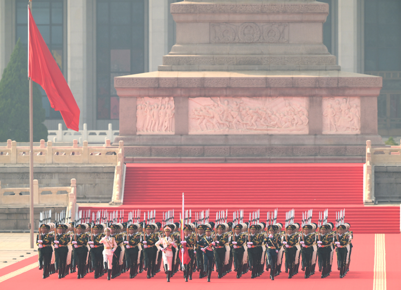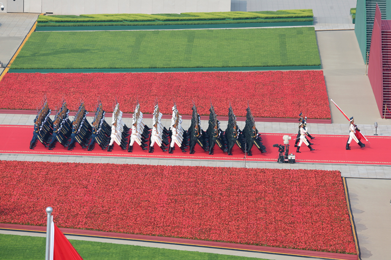 9月3日,纪念中国人民抗日战争暨世界反法西斯战争胜利80周年大会在北京隆重举行。这是国旗护卫队官兵护卫着五星红旗,从人民英雄纪念碑行进至广场北侧升旗区。