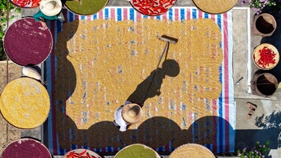 秋收时节,在安徽省黄山市歙县深渡镇阳产村,村民利用晴好天气,抓紧晾晒收获的辣椒、玉米、山核桃等农作物,描绘出一幅山村“晒秋”图。