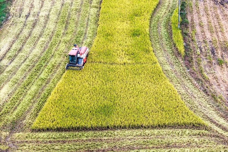 10月15日,在湖南省娄底市双峰县荷叶镇白泥村,农民驾驶农机收割晚稻(无人机照片)。