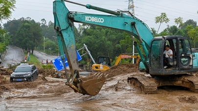 8月5日,救援机械在肇庆市端州区清理路面淤泥。