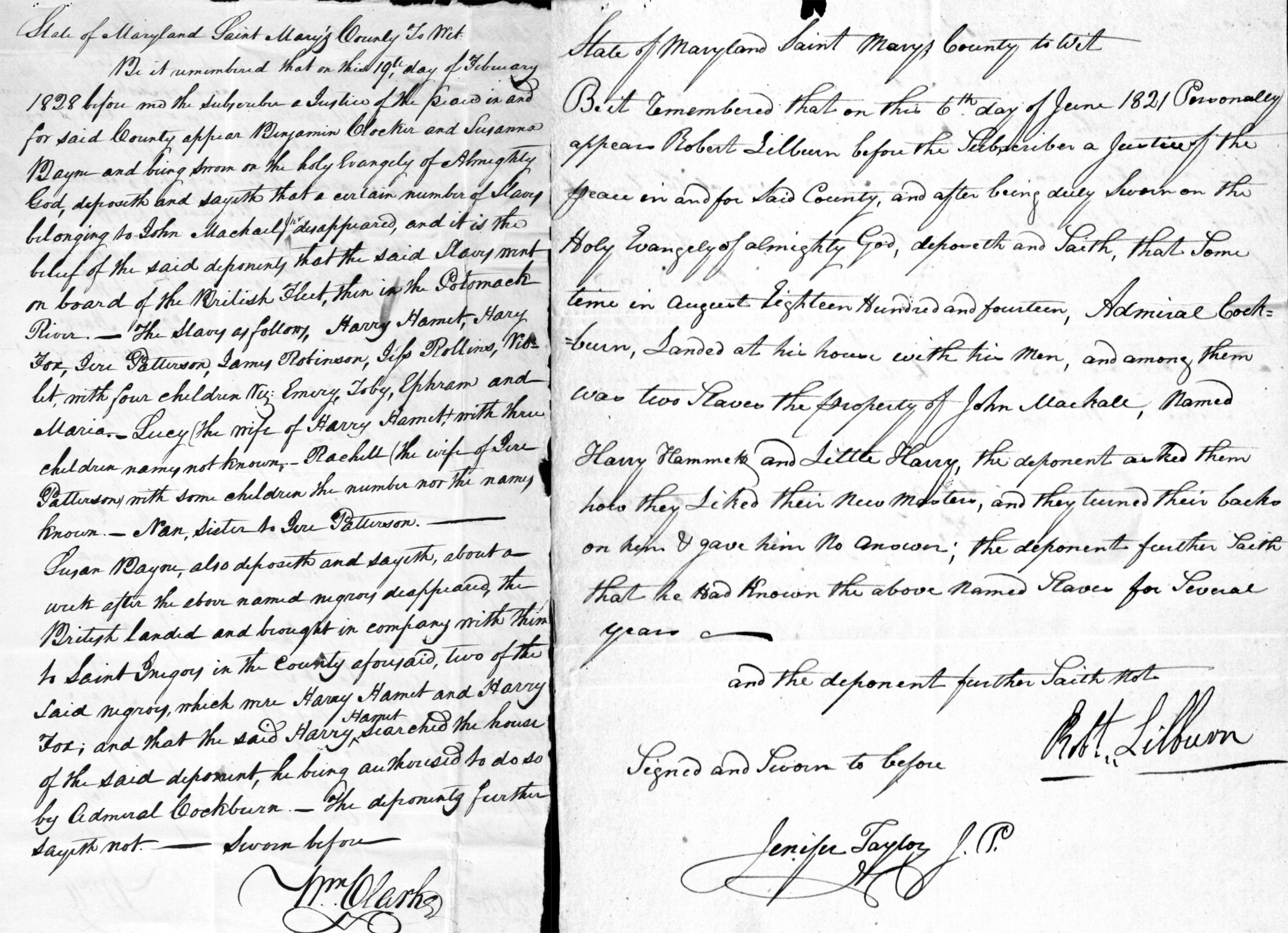 该文件称,1814年8月,“考克伯恩海军上将和他的士兵在罗伯特·利尔本的家中登陆。 其中有两个奴隶,是约翰·麦考尔的财产,一个叫哈利·哈梅特,一个叫小哈利。 证人问他们:“他们喜欢他们的新主人吗?”’他们转过身去,不回答他的话。”