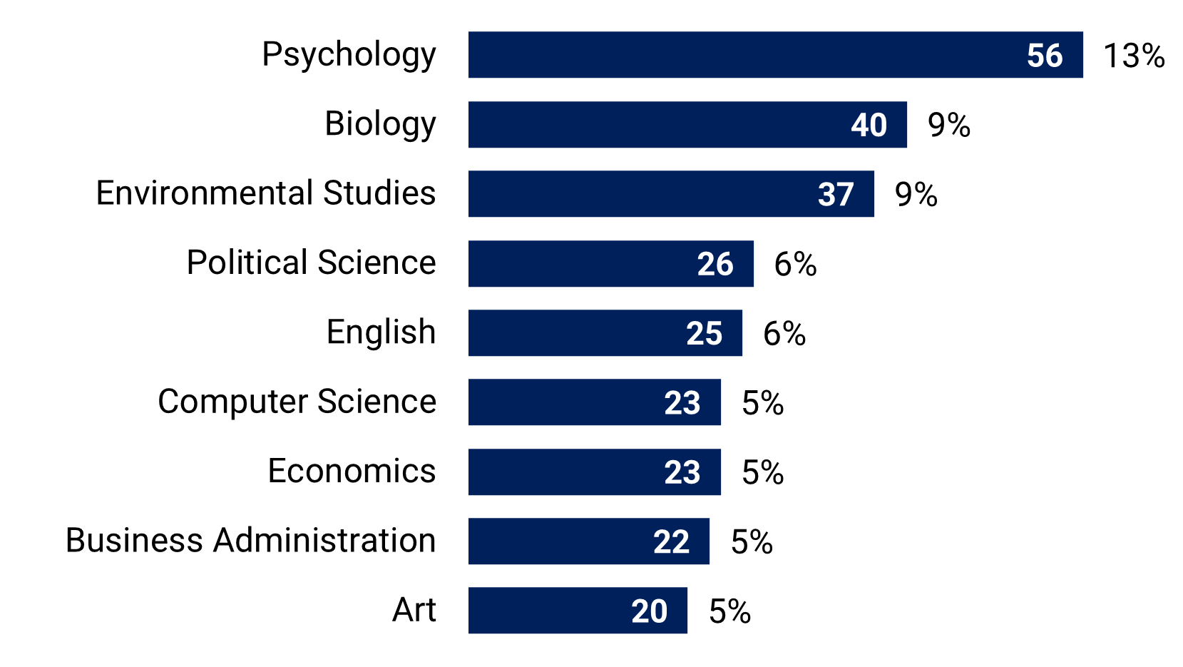 由本科专业、本科辅修和教学艺术硕士(MAT)认证领域授予的学位数量。