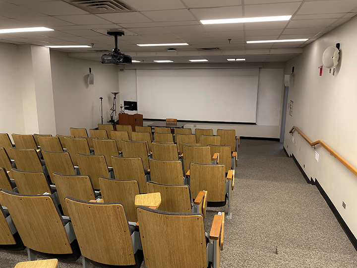 75个座位,高清投影仪和信号,音响系统,PC笔记本电脑,苹果笔记本电脑连接,蓝光/DVD, VHS,电视,白板墙