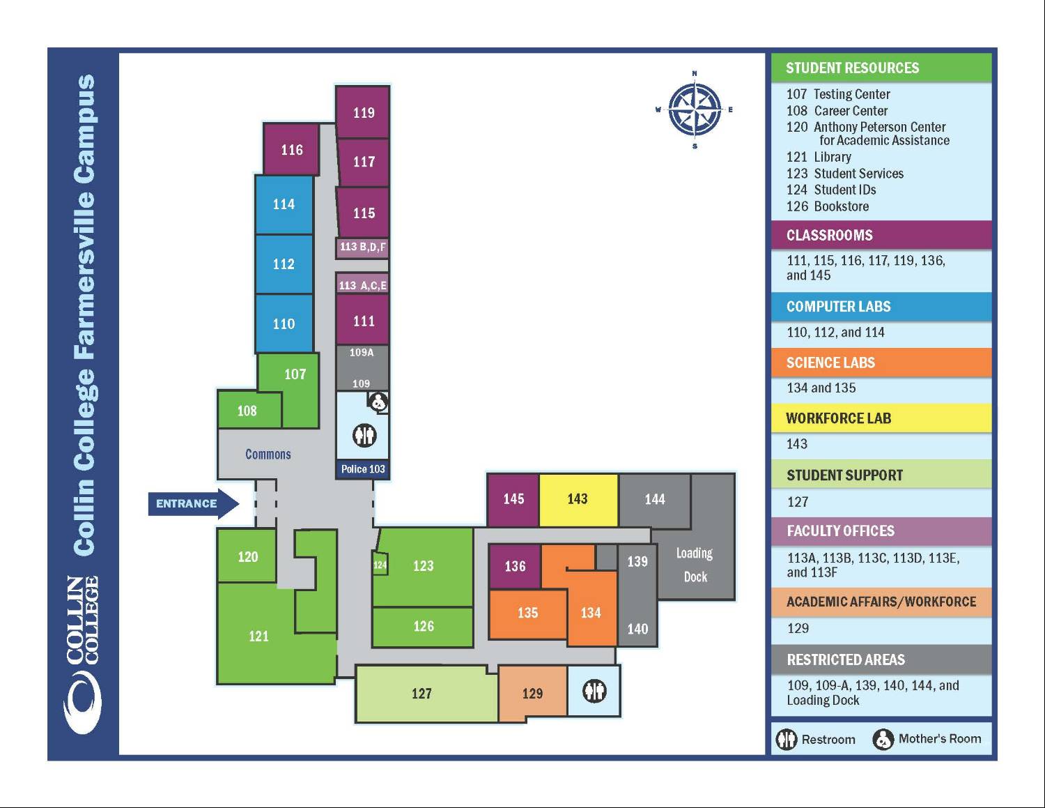 The 弗里斯科 Campus is located on Wade Boulevard between Preston Road and Hillcrest Road (about 2 miles north of State Highway 121). The 图书馆 is in the L Building in the center of campus. Entrances to the 图书馆 are located across from Founders Hall and across from the IT Center.