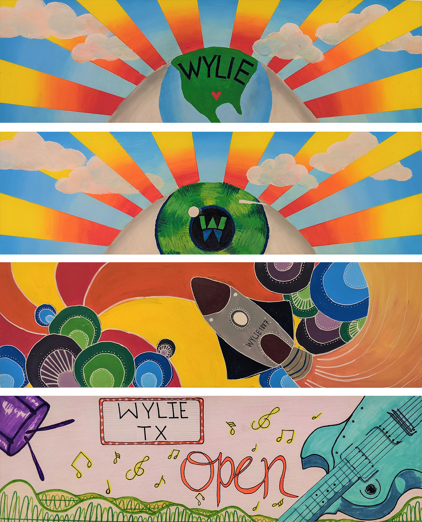 Potential mural ideas for Wylie as proposed by Collin College studentsErika McIlnay, the art and music coordinator at Wylie Campus, has been working with the City of Wylie Public Art Board in preparation for a mural planned for Ballard Street near state Highway 78. The following images are Collin College student proposals for the mural. The first two are Shea Ameen’s designs based on the slogan “Wide Awake Wylie.” Marina Godkin’s rocket ship design is named “Traveling Through the Future” and incorporates Wylie’s founding date and the school colors of its two high schools. “Feel the Groove” by Delilah Mireles reflects her vision of Wylie as a lively city with music that brings people together.